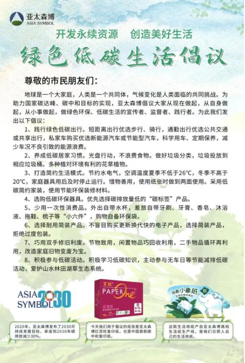 值得一提的是,本次倡議用紙專門(mén)選用了亞太森博“紅百旺”復(fù)印紙,這是中國(guó)第一款“碳中和”復(fù)印紙。另外,倡議中還專門(mén)介紹了亞太森博“到2030年碳排放減少30%”的可持續(xù)發(fā)展目標(biāo),展示了公司愿與廣大市民攜手共建低碳社會(huì)的信心和決心。