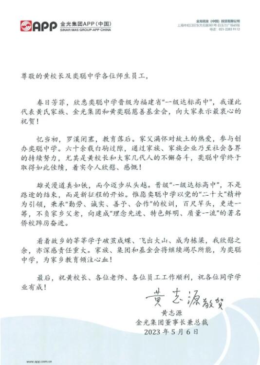 近日,福建省教育廳發(fā)布《關(guān)于公布省級達標高中評估結(jié)果的通知》,泉州市奕聰中學(xué)晉升省“一級達標高中”。金光集團董事長兼總裁黃志源先生代表金光集團及黃奕聰慈善基金會,具函向奕聰中學(xué)表示祝賀。
