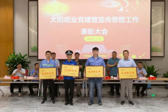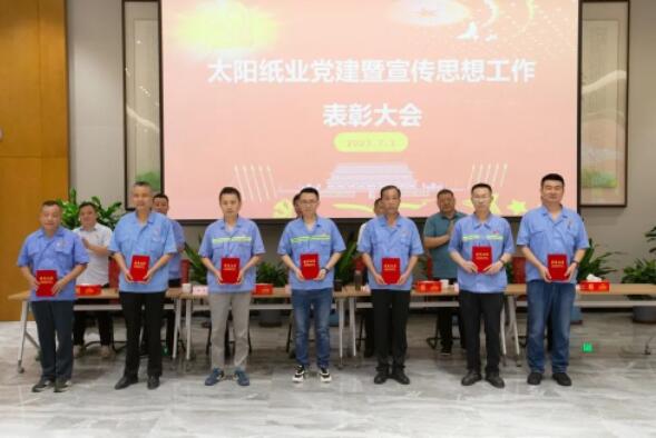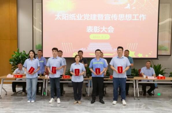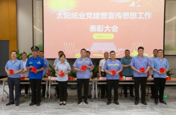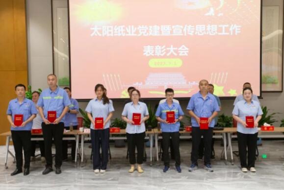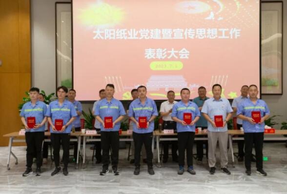7月1日,山東太陽紙業股份有限公司黨委組織召開了黨建暨宣傳思想工作大會,熱烈慶祝中國共產黨成立102周年,隆重表彰2022年—2023年太陽紙業在黨建和宣傳戰線中涌現出的先進單位和個人。公司黨委副書記、副總經理應廣東,公司黨委紀委書記、組織委員、機關黨支部書記、副總經理陳昭軍,公司黨委委員、宣傳委員、副總經理王宗良,公司副總經理龐福成,公司各黨支部書記代表張文東、邵作運、吳文春,及各黨團支部代表、宣傳骨干代表參會。