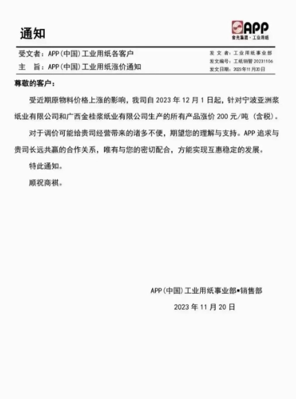 APP(中國)工業用紙事業部:受近期原物料價格上漲的影響,我司自2023年12月1日起針對寧波亞洲漿紙業有限公司和廣西金桂漿紙業有限公司生產的所有產品漲價200元/噸(含稅)