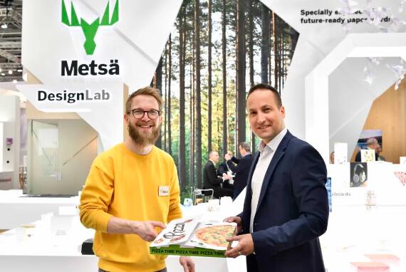 結構包裝設計師IiroNumminen與包裝服務總監IlkkaHarju在Interpack的芬林紙板展臺上展示該超輕披薩盒方案
