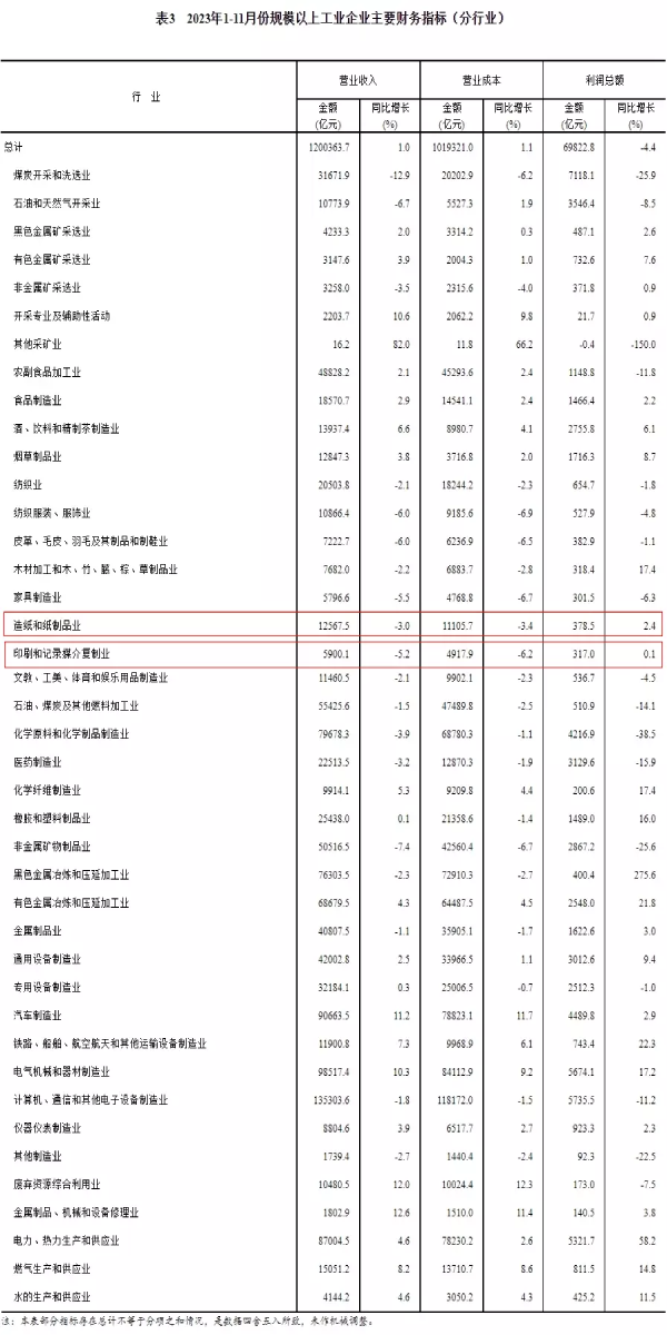 在41個(gè)工業(yè)大類行業(yè)中,造紙和紙制品業(yè)在1-11月份實(shí)現(xiàn)利潤總額378.5億元,同比增長2.4%;印刷和記錄媒介復(fù)制業(yè)在1-11月份實(shí)現(xiàn)利潤總額317.0億元,同比增長0.1%。 在營業(yè)收入方面,1-11月份,規(guī)模以上工業(yè)企業(yè)實(shí)現(xiàn)營業(yè)收入120.04萬億元,同比增長1.0%。其中,造紙和紙制品業(yè)實(shí)現(xiàn)營業(yè)收入12567.5億元,同比下降3.0%;印刷和記錄媒介復(fù)制業(yè)實(shí)現(xiàn)營業(yè)收入5900.1億元,同比下降5.2%。