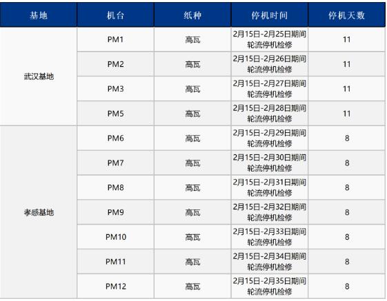 自2024年2月15日-2月25日期間,武漢金鳳凰紙業對11臺瓦楞紙機臺進行輪流停機檢修安排,其中武漢基地4臺紙機停機時間11天,孝感基地7臺紙機停機時間8天。
