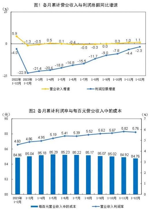 2023年,規模以上工業企業實現營業收入133.44萬億元,比上年增長1.1%;發生營業成本113.10萬億元,增長1.2%;營業收入利潤率為5.76%,比上年下降0.20個百分點。其中,造紙和紙制品業實現營業收入13926.2億元,同比下降2.4%;印刷和記錄媒介復制業實現營業收入6576.9億元,同比下降4.7%。 2023年末,規模以上工業企業資產總計167.36萬億元,比上年增長6.0%;負債合計95.57萬億元,增長5.9%;所有者權益合計71.79萬億元,增長6.2%;資產負債率為57.1%,比上年下降0.1個百分點。 2023年末,規模以上工業企業應收賬款23.72萬億元,比上年增長7.6%;產成品存貨6.14萬億元,增長2.1%。 2023年,規模以上工業企業每百元營業收入中的成本為84.76元,比上年增加0.04元;每百元營業收入中的費用為8.56元,比上年增加0.20元。 2023年末,規模以上工業企業每百元資產實現的營業收入為82.4元,比上年減少4.9元;人均營業收入為181.5萬元,比上年增加5.9萬元;產成品存貨周轉天數為19.3天,比上年增加0.9天;應收賬款平均回收期為60.6天,比上年增加4.4天。 12月份,規模以上工業企業實現利潤同比增長16.8%。 國家統計局工業司統計師于衛寧解讀工業企業利潤數據表示,2023年,國內需求逐步改善,工業生產穩步回升,規模以上工業企業效益持續恢復,主要行業利潤積極改善,新動能培育壯大,工業經濟高質量發展基礎進一步鞏固。超六成行業全年利潤實現增長,七成行業利潤呈回升態勢。2023年,在41個工業大類行業中,有27個行業利潤比上年增長,利潤增長面為65.9%,比上年擴大12.2個百分點;有29個行業全年利潤增速比1—11月份加快或降幅收窄、由降轉增,呈回升態勢,占70.7%。