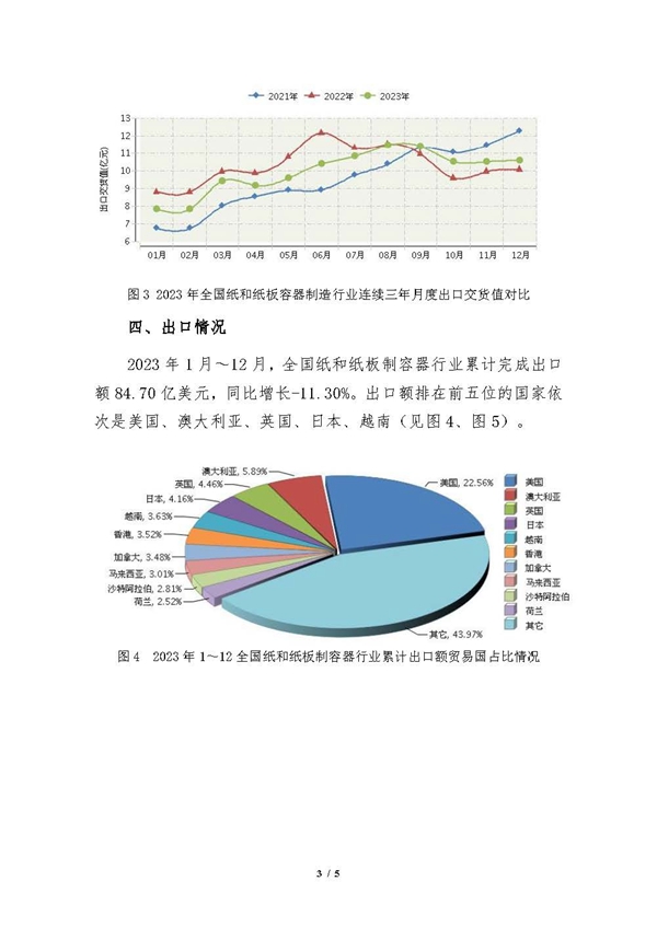 日前,中國包裝聯合會公布了《2023年12月紙和紙板容器行業經濟運行簡報》。 數據顯示,2023年1月-12月,全國紙和紙板容器制造行業累計完成主營業務收入2682.57億元,同比增長-4.44%。其中,12月份完成主營業務收入270.32億元,同比增長9.77%。 在主要經濟效益指標方面,2023年1月-12月,全國紙和紙板容器制造行業累計完成利潤總額108.67億元,同比增長35.65%;累計主營業務收入利潤率為4.05%,同比增長1.20%;累計虧損面為23.04%,同比增長1.14%。 2023年12月紙和紙板容器行業經濟運行簡報