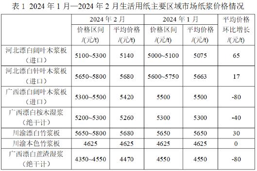 據(jù)《生活用紙》雜志調(diào)研數(shù)據(jù),2024年2月各類(lèi)紙漿原料平均價(jià)格相較2024年1月,雖然有所波動(dòng),但變化幅度較小,總體價(jià)格相對(duì)穩(wěn)定。2月上旬和中旬,紙漿價(jià)格整體處于穩(wěn)定狀態(tài),春節(jié)返工后,河北地區(qū)進(jìn)口木漿平均價(jià)格有所上漲,廣西地區(qū)各類(lèi)紙漿平均價(jià)格有所下降。