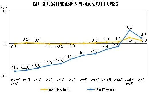 1—3月份,規模以上工業企業實現營業收入30.96萬億元,同比增長2.3%;發生營業成本26.38萬億元,增長2.5%;營業收入利潤率為4.86%,同比提高0.09個百分點。