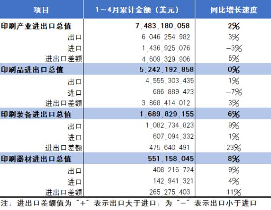 本期,國內(nèi)印刷產(chǎn)業(yè)進出口呈現(xiàn)如下特征: (1)從規(guī)模總量增長態(tài)勢看,產(chǎn)業(yè)進出口運行平穩(wěn)、并保持同比增長 1~4月,國內(nèi)印刷產(chǎn)業(yè)進出口同比增長2%,與上期增幅持平。最近幾年,國內(nèi)印刷產(chǎn)業(yè)進出口各年同期的同比增速表現(xiàn)出從大起大落到逐漸回穩(wěn)的態(tài)勢。從-30%(2020年)、12%(2021年)、8%(2022年)、0%(2023年)到2%(2024年),國內(nèi)印刷產(chǎn)業(yè)進出口已經(jīng)步入平穩(wěn)運行的軌道。 (2)從商品出口和進口結(jié)構(gòu)動態(tài)看,出口和進口占比結(jié)構(gòu)相對穩(wěn)定。出口商品中,印刷品、印刷裝備、印刷器材同步增長;而進口商品中,印刷品繼續(xù)下行、印刷裝備由降轉(zhuǎn)增、印刷器材保持增長 1~4月國內(nèi)印刷產(chǎn)業(yè)出口同比增長3%、進口則同比下降3%。產(chǎn)業(yè)進出口占比中,出口81%、進口19%。與去年同期相比,出口占比提升了1個百分點、進口占比下降了一個百分點。 同期,出口商品中,印刷品、印刷裝備、印刷器材出口均處于同比增長狀態(tài),其同比增長速度分別為1%、9%、9%。而相對應(yīng)的進口商品,印刷品同比下降7%、印刷裝備同比增長1%、印刷器材同比增長4%。 (3)從全球區(qū)域市場的貿(mào)易分布看,國內(nèi)印刷產(chǎn)業(yè)與亞洲、北美、拉美和非洲市場市場的進出口保持增長,與歐洲、大洋洲市場進出口出現(xiàn)下降 1~4月,國內(nèi)印刷產(chǎn)業(yè)與亞洲市場進出口34.63億美元(同比增長6%)、與歐洲市場進出口15.68億美元(同比下降6%)、與北美洲市場進出口15.25億美元(同比增長1%)、與拉丁美洲市場進出口3.96億美元(同比增長26%)、與非洲市場進出口2.73億美元(同比增長5%)、與大洋洲市場進出口2.58億美元(同比下降20%)。同期,國內(nèi)印刷產(chǎn)業(yè)進出口在全球各區(qū)域市場的分布為亞洲46%、歐洲21%、北美洲20%、拉美5%、非洲4%、大洋洲3%。 另外,1~4月國內(nèi)印刷產(chǎn)業(yè)與東盟進出口14.22億美元(同比增長21%)、與歐盟進出口11.38億美元(同比下降3%)、與中東地區(qū)進出口5.20億美元(同比增長13%)。 (4)從主要貿(mào)易伙伴進出口貿(mào)易額及變化情況看,國內(nèi)印刷產(chǎn)業(yè)與美國進出口呈現(xiàn)停滯,與日本、德國、英國、澳大利亞等發(fā)達經(jīng)濟體市場進出口同比下滑,與越南、墨西哥市場進出口同比大幅增長 1~4月,居國內(nèi)印刷產(chǎn)業(yè)進出口前列的貿(mào)易伙伴進出口情況: ·美國:進出口14.14億美元(同比持平)。其中,出口11.34億美元(同比下降1%),進口2.81億美元(同比增長5%); ·日本:進出口5.80億美元(同比下降2%)。其中,出口2.11億美元(同比下降15%)、進口3.69億美元(同比增長7%); ·德國:進出口3.35億美元(同比下降12%)。其中,出口1.37億美元(同比增長7%),進口1.98億美元(同比下降22%); ·英國:進出口2.44億美元(同比下降5%)。其中,出口1.99億美元(同比下降4%)、進口4463.58萬美元(同比下降10%); ·澳大利亞:進出口2.24億美元(同比下降24%)。其中,出口2.19億美元(同比下降25%),進口536.76萬美元(同比增長20%); 同期,國內(nèi)印刷產(chǎn)業(yè)與全球產(chǎn)業(yè)供應(yīng)鏈調(diào)整熱點國家進出口情況: ·越南:進出口3.48億美元(同比增長33%)。其中,出口3.42億美元(同比增長33%),進口654.73萬美元(同比增長24%); ·印度:進出口1.86億美元(同比增長1%)。其中,出口1.84億美元(同比增長2%),進口204.62萬美元(同比下降21%); ·墨西哥:進出口1.45億美元(同比增長22%)。其中,出口1.15億美元(同比增長18%),進口3001.90萬美元(同比增長37%); 國內(nèi)印刷品出口和進口基本情況 2024年1~4月國內(nèi)印刷品出口45.55億美元(參見表2),同比增長1%。其中,出版物印刷品出口5.09億美元(同比下降2%)、包裝裝潢印刷品出口26.20億美元(同比增長3%)、商務(wù)印刷品出口14.26億美元(同比下降1%)。 表22024年1~4月國內(nèi)印刷品進出口總值表