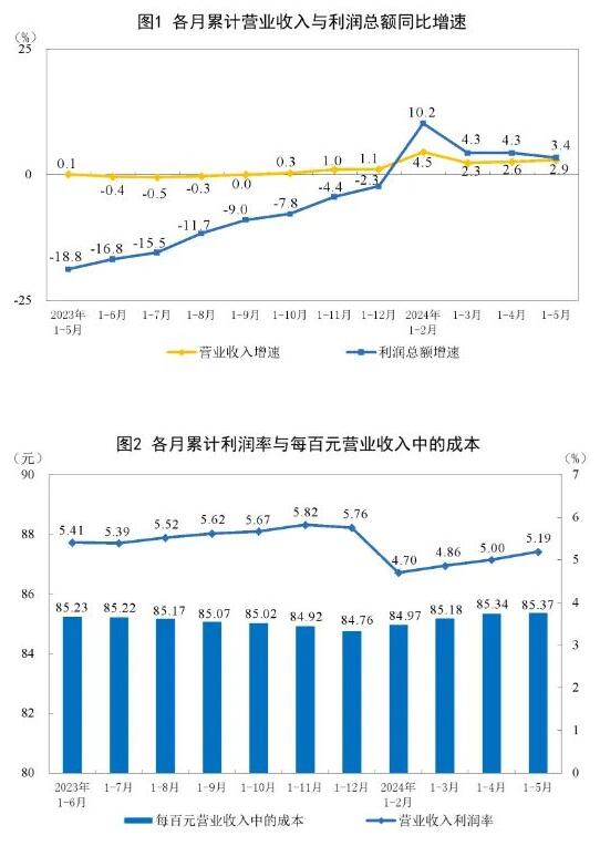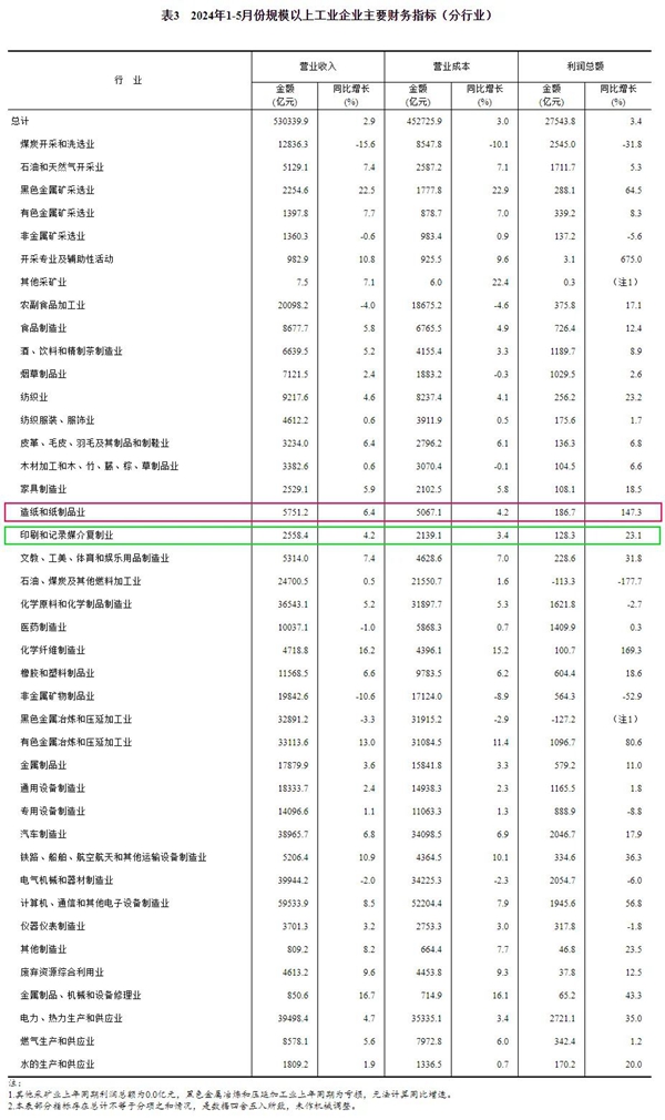 值得關(guān)注的是,造紙和紙制品業(yè)實現(xiàn)利潤總額186.7億元,同比增長147.3%;印刷和記錄媒介復(fù)制業(yè)實現(xiàn)利潤總額128.3億元,同比增長23.1%。 1—5月份,規(guī)模以上工業(yè)企業(yè)實現(xiàn)營業(yè)收入53.03萬億元,同比增長2.9%;發(fā)生營業(yè)成本45.27萬億元,增長3.0%;營業(yè)收入利潤率為5.19%,同比提高0.02個百分點。其中,造紙和紙制品業(yè)實現(xiàn)營業(yè)收入5751.2億元,同比增長6.4%;印刷和記錄媒介復(fù)制業(yè)實現(xiàn)營業(yè)收入2558.4億元,同比增長4.2%。 5月末,規(guī)模以上工業(yè)企業(yè)資產(chǎn)總計171.26萬億元,同比增長6.0%;負(fù)債合計98.44萬億元,增長5.7%;所有者權(quán)益合計72.81萬億元,增長6.2%;資產(chǎn)負(fù)債率為57.5%,同比下降0.1個百分點。 5月末,規(guī)模以上工業(yè)企業(yè)應(yīng)收賬款24.23萬億元,同比增長8.0%;產(chǎn)成品存貨6.39萬億元,增長3.6%。 1—5月份,規(guī)模以上工業(yè)企業(yè)每百元營業(yè)收入中的成本為85.37元,同比增加0.06元;每百元營業(yè)收入中的費用為8.38元,同比增加0.04元。 5月末,規(guī)模以上工業(yè)企業(yè)每百元資產(chǎn)實現(xiàn)的營業(yè)收入為75.1元,同比減少2.4元;人均營業(yè)收入為176.0萬元,同比增加7.7萬元;產(chǎn)成品存貨周轉(zhuǎn)天數(shù)為20.7天,同比持平;應(yīng)收賬款平均回收期為66.8天,同比增加3.4天。 5月份,規(guī)模以上工業(yè)企業(yè)實現(xiàn)利潤同比增長0.7%。 國家統(tǒng)計局工業(yè)司統(tǒng)計師于衛(wèi)寧解讀工業(yè)企業(yè)利潤數(shù)據(jù)表示,5月份,隨著宏觀政策效應(yīng)持續(xù)釋放,市場需求穩(wěn)步恢復(fù),工業(yè)生產(chǎn)平穩(wěn)增長,規(guī)模以上工業(yè)企業(yè)效益延續(xù)恢復(fù)態(tài)勢,利潤繼續(xù)保持增長,呈現(xiàn)以下主要特點:工業(yè)企業(yè)利潤保持增長;工業(yè)企業(yè)營收持續(xù)回升;近八成行業(yè)利潤實現(xiàn)增長;裝備制造業(yè)成為利潤增長重要引擎;消費品制造業(yè)利潤保持兩位數(shù)增長;原材料制造業(yè)利潤降幅收窄;企業(yè)當(dāng)月單位成本同比、環(huán)比均有所減少。總體看,1—5月份規(guī)上工業(yè)企業(yè)效益持續(xù)恢復(fù),但也要看到,國內(nèi)有效需求仍然不足,內(nèi)生動力有待加強,工業(yè)企業(yè)效益恢復(fù)基礎(chǔ)仍不牢固。