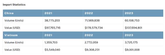 2024年6月25日,美國商務部發布公告,對進口自中國和越南的紙盤(CertainPaperPlates)作出反補貼肯定性初裁,初步裁定: (1)中國企業: 福州恒利紙業有限公司(FuzhouHengliPaperCo.,Ltd.)稅率為11.53%; 金華市達達紙塑制品有限公司(JinhuaP&PProductCo.,Ltd.)稅率為3.54%; 寧波創酷國際貿易有限公司(NingboArtcoolCo.,Ltd.);寧波奉化永發印務文具有限公司(NingboFenghuaYongfaPrintingStationeryCo.,Ltd.);浙江金晟環保股份有限公司(ZhejiangKingsunEco-PackCo.,Ltd.);浙江凌榮工藝品有限公司(ZhejiangLingrongCraftsCo.,Ltd.)因未配合應訴,被適用313.14%的懲罰性稅率; 其他生產商/出口商的稅率為10.64%。 (2)越南企業: Go-PakPaperProductsVietnamCo.,Ltd.稅率為5.48%; InnovativeSonicVietnamInternational、NingboChangyaPlasticVietnamCompany、NingboChangyaPlasticVietnam、SCGVietnam和XieLiVietnamInternationalCompanyLimited因未配合應訴,被適用237.65%的懲罰性稅率; 其他生產商/出口商的稅率為為5.48%。 美國商務部預計將于2024年11月5日作出反補貼終裁。本案涉及美國海關編碼4823.69.0040項下產品。 2021-2023年,美國自中國和越南的紙盤的進口量和進口金額如下: