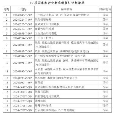 近年來,全國造紙工業標準化技術委員會(以下簡稱“造紙標委會”)始終聚焦“消費品安全、產品質量提升、綠色制造”等核心領域開展標準研制,先后完成了《紙巾》《紙尿褲第1部分:嬰兒紙尿褲》《嬰幼兒及兒童用紙品基本安全技術規范》《綠色產品評價紙和紙制品》《再生紙漿》等多項重要標準,為提升產品質量和安全性、保障消費者權益、促進行業綠色、可持續發展發揮了重要引領作用。 2024年,造紙標委會繼續堅持以行業需求為導向,不斷深化和完善造紙工業標準體系,引領造紙行業綠色、高質量發展。截止目前,共有11項國家和行業標準獲批發布,19項國家和行業標準制修訂計劃批準下達。 11項標準獲批發布 11項發布標準中有兩項國家標準,9項行業標準。《制漿造紙行業綠色工廠評價要求》《綠色供應鏈管理評價規范造紙工業》《制漿造紙行業節能診斷技術導則》等4項綠色制造相關標準的發布,為造紙企業開展綠色工廠和綠色供應鏈評價、節能診斷提供了技術依據,有助于促進造紙行業節能減排,推動造紙行業綠色低碳發展。《熱敏紙》《超級電容器紙》《寵物尿墊(褲)》等7項產品標準的發布,對規范企業生產、引領產品質量提升和技術創新,助推造紙工業健康發展具有重要意義。