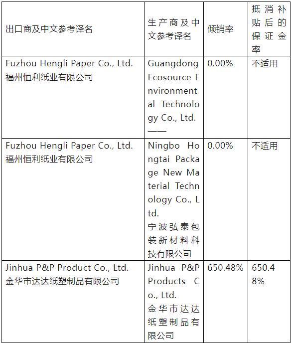 2024年8月30日,美國商務部宣布對進口自中國、泰國和越南的紙盤(Certain Paper Plates)作出反傾銷初裁,初步裁定中國生產商/出口商的傾銷率為0.00%~1039.05%(抵消補貼后的保證金調整為不適用~1039.05%,具體稅率詳見下表)、泰國生產商/出口商的傾銷率為4.23%~73.17%、越南生產商/出口商的傾銷率為0.00%~165.27%(抵消補貼后的保證金調整為0.00%~159.79%)。美國商務部預計將于2025年1月13日對本案作出反傾銷終裁。本案涉及美國海關編碼4823.69.0040項下產品。