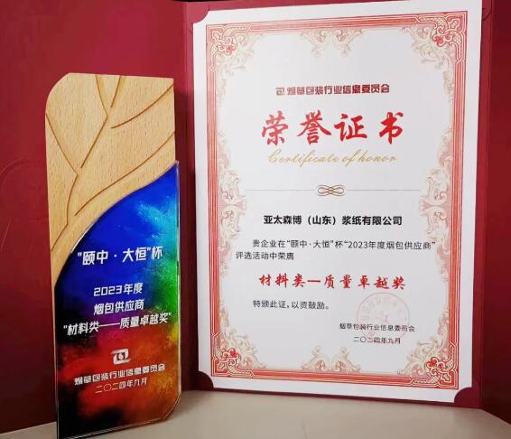 9月11日,2024年煙草包裝最新發(fā)展趨勢(shì)研討會(huì)暨2023年度煙草包裝系列評(píng)選活動(dòng)頒獎(jiǎng)慶典在青島舉行。亞太森博榮獲2023年度煙包供應(yīng)商“材料類(lèi)——質(zhì)量卓越獎(jiǎng)”。