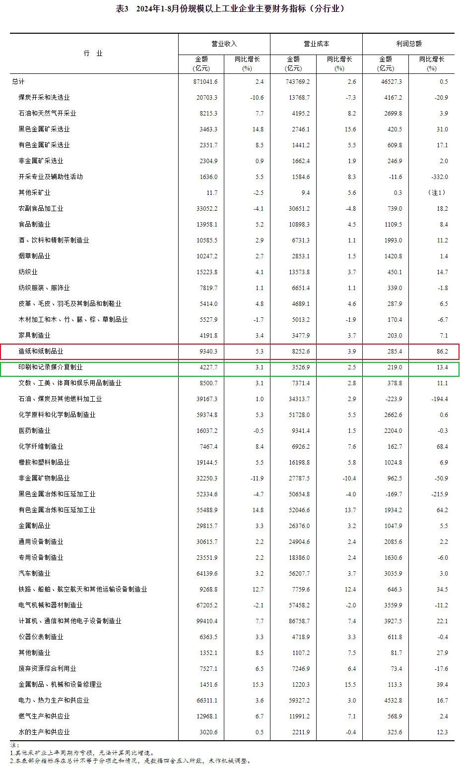 值得關(guān)注的是,造紙和紙制品業(yè)實現(xiàn)利潤總額285.4億元,同比增長86.2%;印刷和記錄媒介復(fù)制業(yè)實現(xiàn)利潤總額219.0億元,同比增長13.4%。 1—8月份,規(guī)模以上工業(yè)企業(yè)實現(xiàn)營業(yè)收入87.10萬億元,同比增長2.4%;發(fā)生營業(yè)成本74.38萬億元,增長2.6%;營業(yè)收入利潤率為5.34%,同比下降0.10個百分點。其中,造紙和紙制品業(yè)實現(xiàn)營業(yè)收入9340.3億元,同比增長5.3%;印刷和記錄媒介復(fù)制業(yè)實現(xiàn)營業(yè)收入4227.7億元,同比增長3.1%。 8月末,規(guī)模以上工業(yè)企業(yè)資產(chǎn)總計173.71萬億元,同比增長4.8%;負債合計100.11萬億元,增長4.6%;所有者權(quán)益合計73.60萬億元,增長5.2%;資產(chǎn)負債率為57.6%,同比下降0.2個百分點。 8月末,規(guī)模以上工業(yè)企業(yè)應(yīng)收賬款25.50萬億元,同比增長8.4%;產(chǎn)成品存貨6.53萬億元,增長5.1%。 1—8月份,規(guī)模以上工業(yè)企業(yè)每百元營業(yè)收入中的成本為85.39元,同比增加0.19元;每百元營業(yè)收入中的費用為8.41元,同比增加0.04元。 8月末,規(guī)模以上工業(yè)企業(yè)每百元資產(chǎn)實現(xiàn)的營業(yè)收入為76.5元,同比減少2.4元;人均營業(yè)收入為180.0萬元,同比增加7.3萬元;產(chǎn)成品存貨周轉(zhuǎn)天數(shù)為20.4天,同比增加0.3天;應(yīng)收賬款平均回收期為66.8天,同比增加3.7天。 受去年同期高基數(shù)等因素影響,8月份,規(guī)模以上工業(yè)企業(yè)利潤同比下降17.8%。 國家統(tǒng)計局工業(yè)司統(tǒng)計師于衛(wèi)寧解讀工業(yè)企業(yè)利潤數(shù)據(jù)表示,受市場有效需求不足以及高溫、暴雨、洪澇等自然災(zāi)害對部分地區(qū)沖擊較大等因素影響,加之8月份當(dāng)月同期基數(shù)較7月份明顯抬高,1—8月份,規(guī)上工業(yè)企業(yè)利潤增速有所回落,但仍延續(xù)年初以來的增長態(tài)勢,以高技術(shù)制造業(yè)為代表的新動能行業(yè)保持較快增長,工業(yè)經(jīng)濟高質(zhì)量發(fā)展持續(xù)穩(wěn)步推進。工業(yè)企業(yè)利潤和營業(yè)收入繼續(xù)保持增長、高技術(shù)制造業(yè)利潤持續(xù)快速增長、消費品制造業(yè)和裝備制造業(yè)利潤保持穩(wěn)定增長。總體看,規(guī)上工業(yè)企業(yè)利潤延續(xù)增長態(tài)勢,工業(yè)新動能支撐作用彰顯,但同時也要看到,國內(nèi)消費需求依然偏弱,外部環(huán)境復(fù)雜多變,工業(yè)企業(yè)效益恢復(fù)基礎(chǔ)仍需繼續(xù)鞏固。