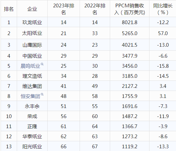 最新一期出版的美國paper360雜志根據2023年(部分企業為財年)企業紙漿、紙張、加工和貿易 (PPCM) 業務的凈銷售額為依據,公布了最新的全球紙業75強名單。