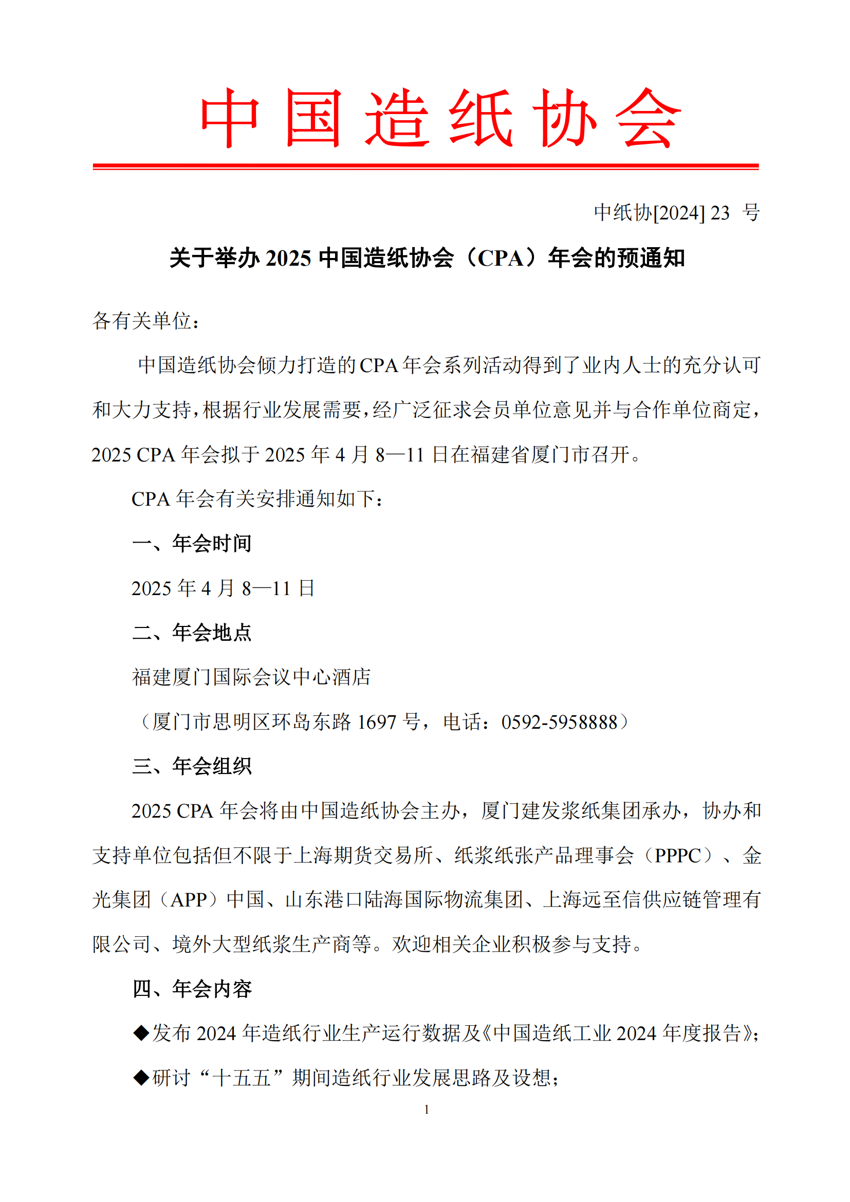 現(xiàn)將“關于舉辦2025 中國造紙協(xié)會(CPA)年會的預通知”發(fā)送給大家,敬請予以關注!
