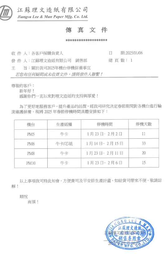 1月6日,理文造紙發(fā)布2025年春節(jié)停機計劃,國內(nèi)四大基地的14臺包裝紙機將在1月中旬至2月中旬期間開展檢修,預計減產(chǎn)26.8萬噸包裝紙,其中包括3萬噸灰底白板紙和23.8萬噸箱板瓦楞紙。