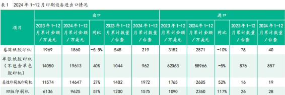 (1)膠印機(jī) 1)卷筒紙膠印機(jī) 2024年1—12月,出口卷筒紙膠印機(jī)219臺(tái),金額1860萬美元,金額同比下降 5.5%。 2023年1—12月,出口卷筒紙膠印機(jī)548臺(tái),金額1969萬美元。 2024年1—12月,進(jìn)口卷筒紙膠印機(jī)40臺(tái),金額2871萬美元,金額同比下降10%。其中,8月從瑞士進(jìn)口到北京2臺(tái),金額1000萬美元;12月從德國進(jìn)口到北京1臺(tái),金額685萬美元。這3臺(tái)設(shè)備的進(jìn)口金額占全年卷筒紙膠印機(jī)進(jìn)口總金額的約60%。 2023年1—12月,進(jìn)口卷筒紙膠印機(jī)78臺(tái),金額3182萬美元。其中,7月從德國進(jìn)口到天津1臺(tái),金額1100萬美元,占全年進(jìn)口總金額的35%。 2)單張紙膠印機(jī)(不包含單色膠印機(jī)) 2024年1—12月,出口單張紙膠印機(jī)1962臺(tái),金額2億美元,金額同比增長40%。 2023年1—12月,出口單張紙膠印機(jī)1044臺(tái),金額1.4億美元。 2024年1—12月,進(jìn)口單張紙膠印機(jī)857臺(tái),金額5.9億美元,金額同比下降5%。 2023年1—12月,進(jìn)口單張紙膠印機(jī)876臺(tái),金額6.2億美元。 (2)柔性印刷版印刷機(jī) 2024年1—12月,出口柔性印刷版印刷機(jī)1972臺(tái),金額1.5 億美元,金額同比增長27%。 2023年1—12月,出口柔性印刷版印刷機(jī)1402臺(tái),金額1.2 億美元。 2024年1—12月,進(jìn)口柔性印刷版印刷機(jī)19臺(tái),金額2685 萬美元,金額同比增長52%。其中,從加拿大進(jìn)口到江蘇1 臺(tái),金額611萬美元;從德國進(jìn)口到湖北1臺(tái),金額267萬美元,這兩臺(tái)設(shè)備占全年柔性印刷版印刷機(jī)進(jìn)口總金額的 1/3. 2023年1—12月,進(jìn)口柔性印刷版印刷機(jī)16 臺(tái),金額1765 萬美元。 (3)凹版印刷機(jī) 2024年1—12月,出口凹版印刷機(jī)1575臺(tái),金額9625萬美元,金額同比增長57%。 2023年1—12月,出口凹版印刷機(jī) 1200臺(tái),金額6136萬美元。 2024年1—12月,進(jìn)口凹版印刷機(jī)28臺(tái),金額2360萬美元,金額同比增長117%。其中,1月從意大利進(jìn)口到江蘇1臺(tái),金額460萬美元;3月從瑞士進(jìn)口到江蘇1臺(tái),金額 806萬美元;8月從瑞士進(jìn)口到江蘇1臺(tái),金額308萬美元;12月從日本進(jìn)口到湖北1臺(tái),金額326萬美元。這4臺(tái)凹版印刷機(jī)的進(jìn)口金額占全年進(jìn)口總金額的81%。 2023年1—12月,進(jìn)口凹版印刷機(jī)26臺(tái),金額1090萬美元。 2. 印刷器材 2024年1—12月印刷器材進(jìn)出口數(shù)據(jù)如表2所示。