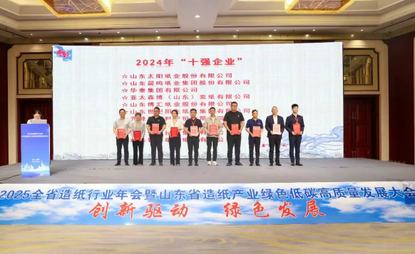 2025年5月8日-9日,以“創(chuàng)新驅(qū)動(dòng)、綠色發(fā)展”為主題的“2025山東省造紙行業(yè)年會(huì)暨山東省造紙產(chǎn)業(yè)綠色低碳高質(zhì)量發(fā)展大會(huì)”在山東德州成功召開(kāi)。會(huì)上,中國(guó)造紙協(xié)會(huì)副理事長(zhǎng)、山東省造紙行業(yè)協(xié)會(huì)專(zhuān)職副會(huì)長(zhǎng)趙振東宣讀了《山東協(xié)會(huì)認(rèn)定“雙十”標(biāo)桿企業(yè)——山東省造紙行業(yè)協(xié)會(huì)“2024年‘十強(qiáng)企業(yè)’‘十佳企業(yè)’”通報(bào)》,其中,山東太陽(yáng)紙業(yè)股份有限公司被認(rèn)定為“2024年‘十強(qiáng)企業(yè)’”。