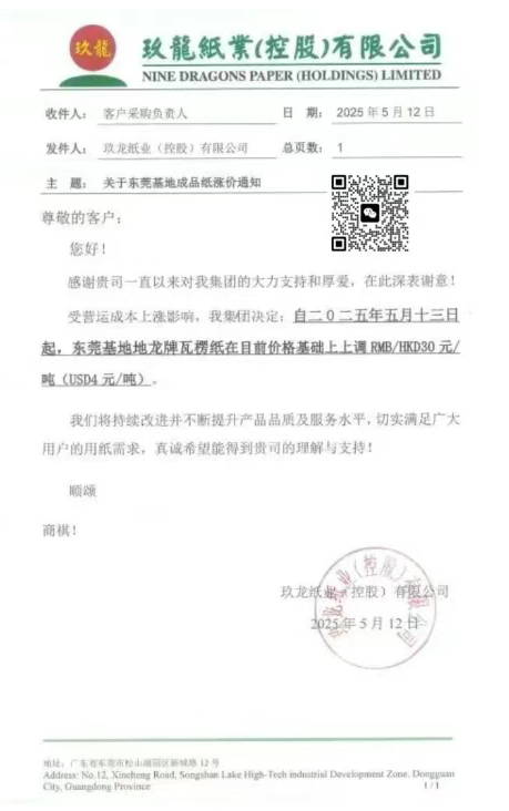 由于成本逐級抬升,為緩解成本上漲帶來的經營壓力,為更好服務客戶,確保持之以恒為客戶提供高品質穩定的產品,保障供貨及時性,山鷹紙業銷售有限公司于5月12日發布調價函,宣布自2025年5月15日起,在原有價格基礎上:浙江基地、安徽基地、福建基地T紙上調20元/噸,瓦紙系上調30元/噸。