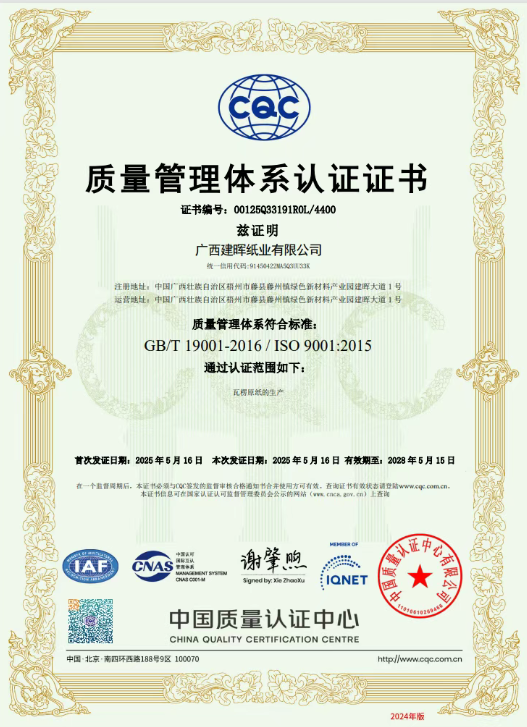 近日,廣西建暉紙業有限公司正式通過 ISO9001質量管理體系認證,并榮獲權威認證證書!這是廣西建暉自成立以來首次完成質量管理體系認證,標志著廣西建暉在規范化、標準化、科學化管理的道路上邁出了堅實且意義非凡的一步!
