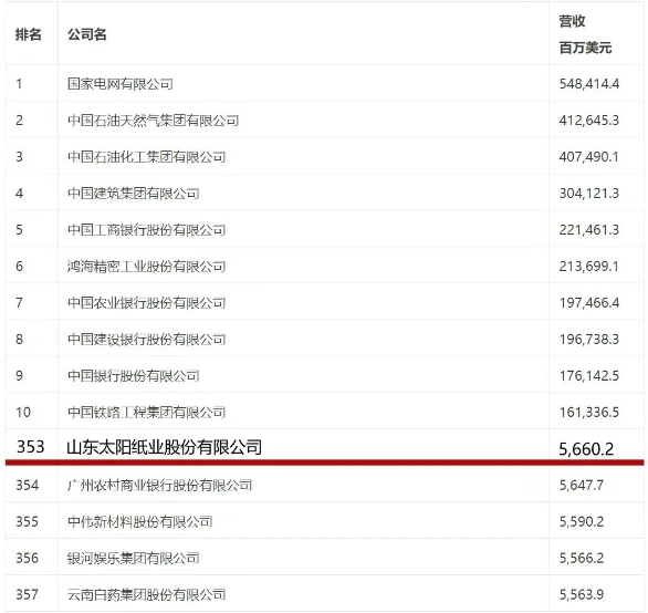 7月22日,財富中文網發布了2025年《財富》中國500強排行榜,山東太陽紙業股份有限公司以56.6億美元的營業收入位列第353位,較去年排名躍升27位。