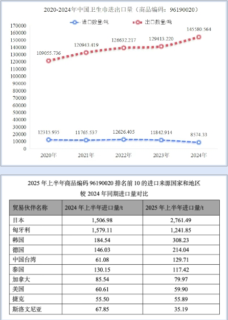 進口 2025年上半年,吸收性衛生用品的進口仍然較少,總進口量為1.21萬t,對國內消費市場影響很小。 衛生巾進口量近年來保持穩定,全年進口總量保持在1.2萬t左右,2024年衛生巾進口量較2023年減少3.268.58t,衛生巾產品已能滿足國內市場消費者的需求。2025年上半年衛生巾進口量較2024年同期增加1.092.35t,分析增長的原因是受2024年11月“衛生巾輿情事件”影響,從日本進口量有所增長,2025年上半年衛生巾從日本的進口量增長1.254.51t。
