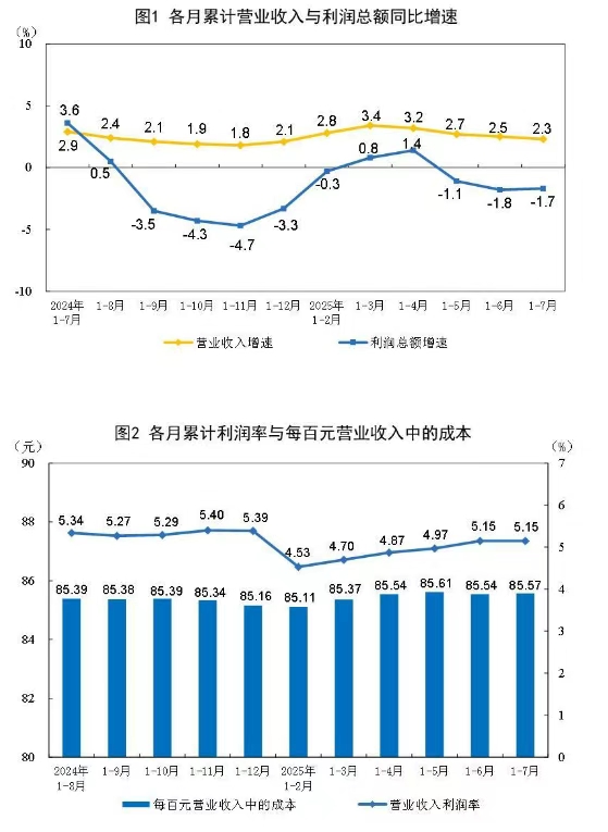 值得關注的是,造紙和紙制品業實現利潤總額203.7億元,同比下降21.9%;印刷和記錄媒介復制業實現利潤總額179.2億元,同比下降4.0%。 1—7月份,規模以上工業企業實現營業收入78.07萬億元,同比增長2.3%;發生營業成本66.80萬億元,增長2.5%;營業收入利潤率為5.15%,同比下降0.21個百分點。其中,造紙和紙制品業實現營業收入7978.2億元,同比下降2.1%;印刷和記錄媒介復制業實現營業收入3669.0億元,同比下降0.7%。 7月末,規模以上工業企業資產總計183.67萬億元,同比增長4.9%;負債合計106.26萬億元,增長5.1%;所有者權益合計77.41萬億元,增長4.6%;資產負債率為57.9%,同比上升0.2個百分點。 7月末,規模以上工業企業應收賬款26.84萬億元,同比增長6.8%;產成品存貨6.67萬億元,增長2.4%。 1—7月份,規模以上工業企業每百元營業收入中的成本為85.57元,同比增加0.24元;每百元營業收入中的費用為8.38元,同比減少0.08元。 7月末,規模以上工業企業每百元資產實現的營業收入為74.0元,同比減少1.9元;人均營業收入為182.6萬元,同比增加5.4萬元;產成品存貨周轉天數為20.5天,同比增加0.2天;應收賬款平均回收期為69.8天,同比增加3.7天。 7月份,規模以上工業企業利潤同比下降1.5%。 國家統計局工業司統計師于衛寧解讀2025年7月份工業企業利潤數據表示,7月份,規模以上工業生產保持穩定增長,促進物價水平合理回升系列政策逐步落地實施,帶動企業盈利水平持續恢復。規模以上工業企業效益狀況呈現以下特點:工業企業營業收入保持增長,利潤降幅連續收窄;制造業利潤較快增長,對規上工業利潤恢復貢獻較大;高技術制造業利潤快速增長,引領作用明顯;“兩新”政策成效顯著,持續帶動行業利潤增長;中小型企業利潤改善明顯,私營企業高于全國平均水平。