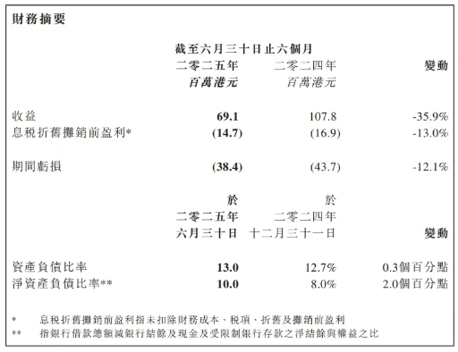近日,合豐集團(tuán)發(fā)布了2025年中期報(bào)告。今年上半年,該集團(tuán)實(shí)現(xiàn)收入6913.4萬(wàn)港元,同比下降35.88%;歸母凈利潤(rùn)虧損3840.6萬(wàn)港元,上年同期虧損4367.7萬(wàn)港元。