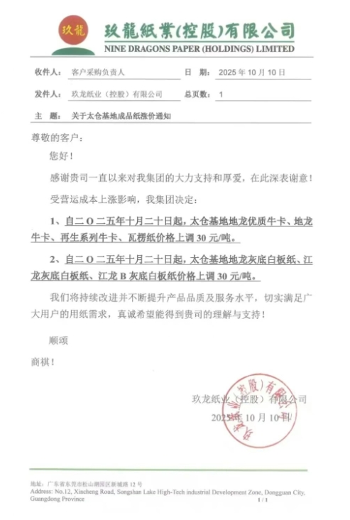 2、自十月二十日起,太倉基地地龍灰底白板紙、江龍灰底白板紙、江龍B灰底白板紙價(jià)格上調(diào)30元/噸。