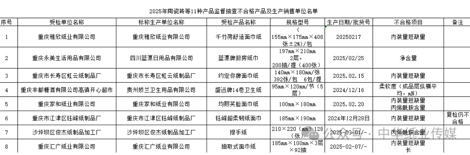 9月19日,重慶市市場監管局網站發布2025年陶瓷磚等11種產品質量市級監督抽查情況通報。本次抽查發現8批次家用紙制品產品不合格。不合格項目涉及允許短缺量、凈含量、柔軟度、丙烯酰胺含量、尺寸偏差、內裝量短缺量。