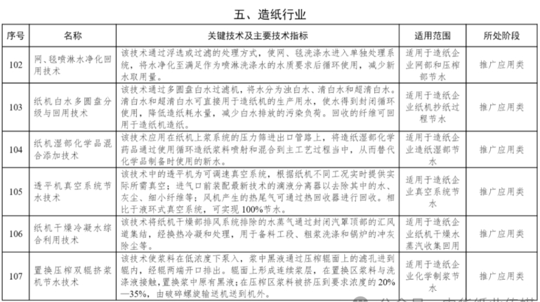 其中,造紙行業(yè)涉及6項(xiàng)技術(shù),包括網(wǎng)、毯噴淋水凈化回用技術(shù),紙機(jī)白水多圓盤分級(jí)與回用技術(shù),紙機(jī)濕部化學(xué)品混合添加技術(shù),透平機(jī)真空系統(tǒng)節(jié)水技術(shù),紙機(jī)干燥冷凝水綜合利用技術(shù),置換壓榨雙輥擠漿機(jī)節(jié)水技術(shù)等。