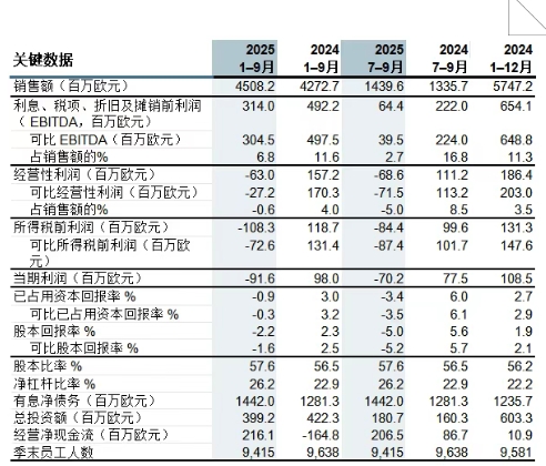 2025年1-9月 (2024年1-9月同比數(shù)據(jù)) 銷售額為45.08億歐元(同比:42.73億歐元) 經(jīng)營性利潤為虧損6300萬歐元(同比:盈利1.57億歐元),可比經(jīng)營利潤為虧損2700萬歐元(同比:盈利1.7億歐元) 稅前利潤為虧損1.08億歐元(同比:盈利1.19億歐元),可比稅前利潤為虧損7300萬歐元(同比:盈利1.31歐元) 可比已占用資本回報率為 -0.3%(同比:3.2%) 經(jīng)營性凈現(xiàn)金流為2.16億歐元(同比:-1.65億歐元) 2025年7-9月 (2024年7-9月同比數(shù)據(jù)) 銷售額為14.40億歐元(同比:13.36億歐元) 經(jīng)營性利潤為虧損 6900萬歐元(同比:盈利1.11億歐元),可比經(jīng)營性利潤為虧損7200萬歐元(同比:盈利1.13億歐元) 稅前利潤為虧損 8400萬歐元(同比:盈利1.0億歐元),可比稅前利潤為虧損 8700萬歐元(同比:盈利1.02億歐元) 可比已占用資本回報率為 -3.5%(同比:6.1%) 經(jīng)營性凈現(xiàn)金流為2.07億歐元(同比:8700萬歐元) 2025年第三季度主要事件 萬友熙(Jussi Vanhanen)于 2025年7月1日正式就任芬林集團總裁兼首席執(zhí)行官。 歐洲及中國市場對商品漿的需求疲軟。芬林集團已暫時縮減其約策諾(Joutseno)木漿廠的生產(chǎn)。 與第二季度相比,芬林集團針葉商品漿的平均銷售價格在歐洲下降了 5%,在中國下降了 7%。 芬林集團紙板交付量較上季度略有下降,平均銷售價格保持穩(wěn)定。受市場環(huán)境影響以及釋放營運資金的需求影響,芬林集團對紙板生產(chǎn)進行了縮減。此外,工廠停機維護及芬蘭辛佩萊(Simpele)投資項目的停產(chǎn)亦對產(chǎn)量及盈利能力造成影響。 2025年第三季度的經(jīng)營業(yè)績受芬蘭凱米生物制品廠氣體爆炸事故相關(guān)事項的影響:其中包括 3000 萬歐元的保險賠償收入,以及因資產(chǎn)受損而計提的 2200 萬歐元減值損失。 鑒于持續(xù)的盈利能力疲軟及市場前景不確定,芬林集團啟動了重大成本節(jié)約及盈利改善計劃的籌備工作,目標為年節(jié)省成本 3 億歐元。