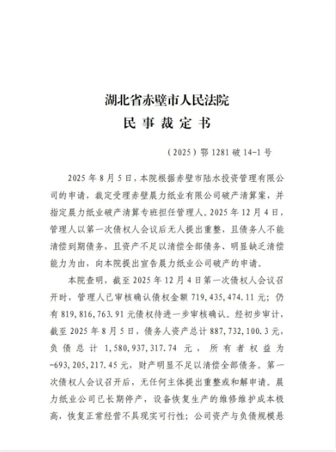 2025年12月4日,赤壁晨力紙業有限公司第一次債權人會議依法召開。會議結束后,無任何主體提出重整或和解申請。