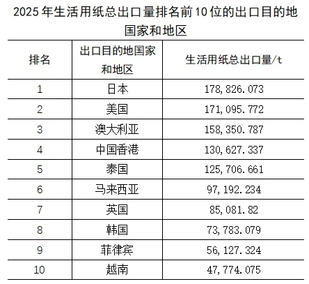 生活用紙 根據(jù)海關(guān)統(tǒng)計數(shù)據(jù),2025年,中國生活用紙出口量連續(xù)4年增長,進(jìn)口量雖也有增長,但總量相對較少。中國生活用紙市場以出口為主,國內(nèi)生活用紙產(chǎn)量和產(chǎn)品種類已經(jīng)能夠滿足本地市場需求,進(jìn)口產(chǎn)品對國內(nèi)市場影響微小。 出口: 2025年,生活用紙總出口量達(dá)到170.44萬t,比2024年增長25.00%;出口金額為25.14億美元,比2024年增長4.39%;出口平均價格比2024年下降16.49%,出口呈現(xiàn)量增價減的趨勢。