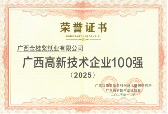 2026年1月30日,廣西高企百強系列榜單暨廣西科技情報研究所2025年度成果發(fā)布會在南寧舉行,會上正式發(fā)布“2025年廣西高新技術企業(yè)百強”等系列榜單,廣西金桂漿紙業(yè)有限公司憑借資源與環(huán)境技術領域的優(yōu)秀表現(xiàn)再度上榜,這也是金桂連續(xù)第五年獲評“廣西高企百強”稱號,持續(xù)彰顯其在科技創(chuàng)新能力、產業(yè)引領作用及高質量發(fā)展水平方面的突出實力與穩(wěn)固地位。