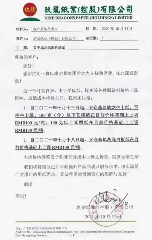 自2021年10月13日起,泉州基地玖龍?垺⒑}埮?堅谀壳皟r格基礎上上調50元/噸,地龍牛卡紙在目前價格基礎上上調100元/噸,再生?、瓦楞紙在目前價格基礎上上調150元/噸。