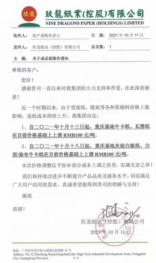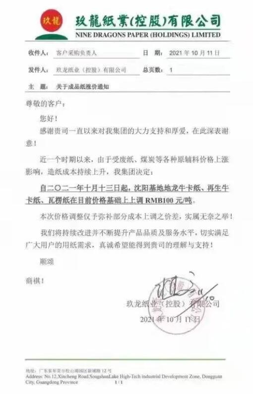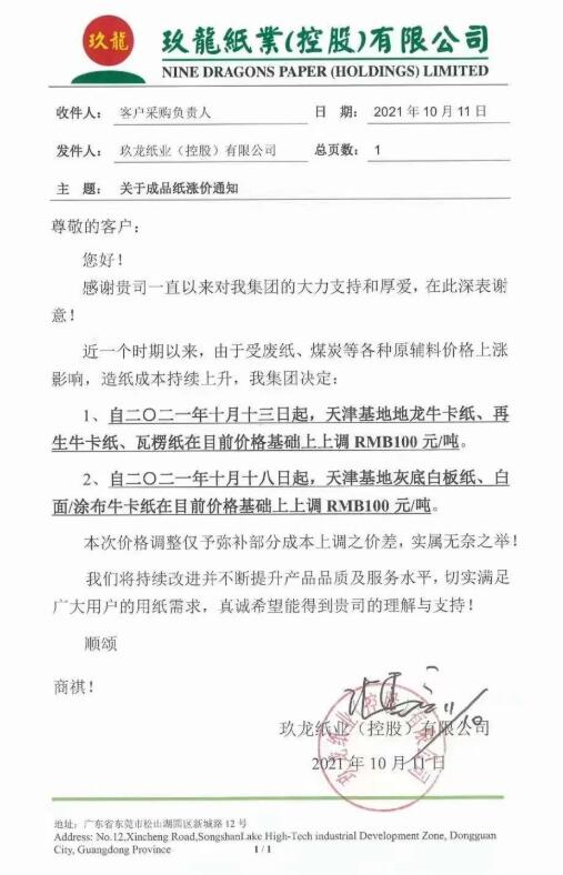10月11日,玖龍紙業旗下東莞、太倉、泉州、天津、重慶、沈陽多個基地發布漲價函,?垺⑼呃慵、白板紙等各類紙種上調50-150元/噸。