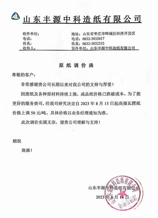 山東豐源中科造紙有限公司:因廢紙及各種原材料持續上漲,成品紙價格已跌破成本。經研究決定自8月15日起高強瓦楞紙價格上調50元/噸。