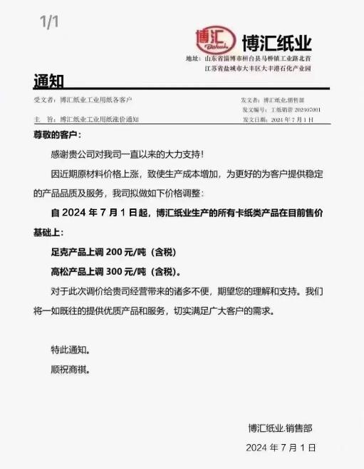 博匯紙業:受近期原材料價格上漲,致使生產成本增加,為更好的為客戶提供穩定的產品品質及服務,我司擬做如下價格調整:自2024年7月1日起,博匯紙業生產的所有卡紙類產品在目前售價基礎上:足克產品上調200元/噸(含稅);高松產品上調300元/噸(含稅)。